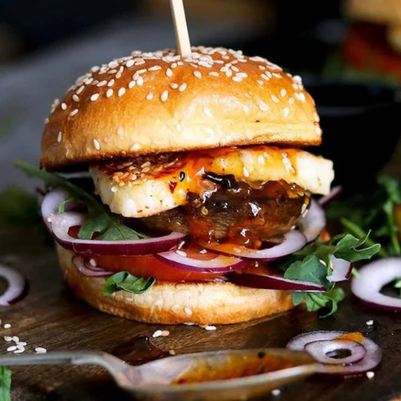 Double the juicy lamb patties, double the golden halloumi, fresh salad, and soft artisan buns—a hearty burger packed with flavor and love!